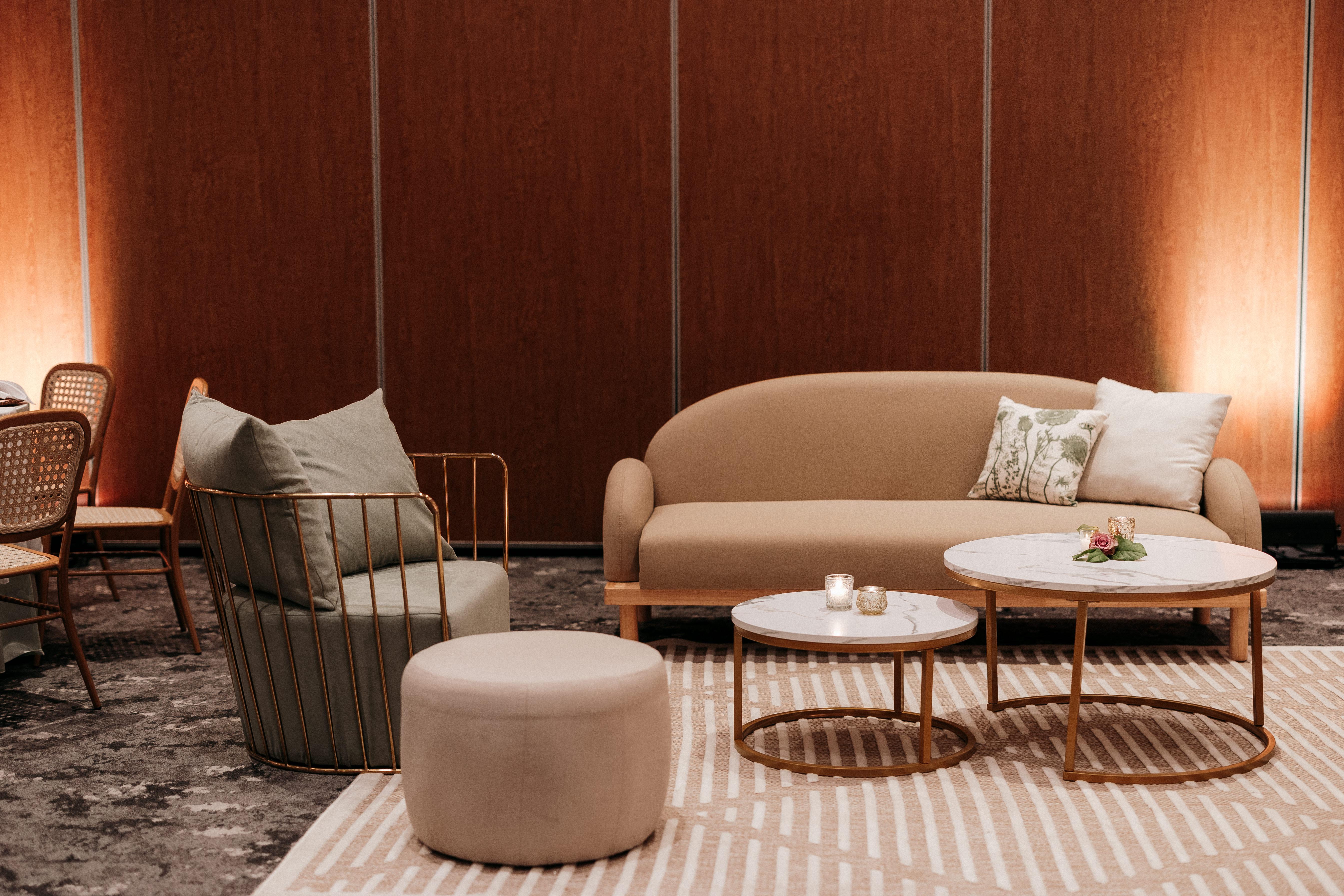 It's easy to make a lounge area irresistible by choosing the right sofas and armchairs that match the theme of the event and coordinating decorative rugs, accessories, and cushions. You can experiment with different types of seating, such as sofas, armchairs, chairs, poufs, etc., to create environments that encourage social interaction.