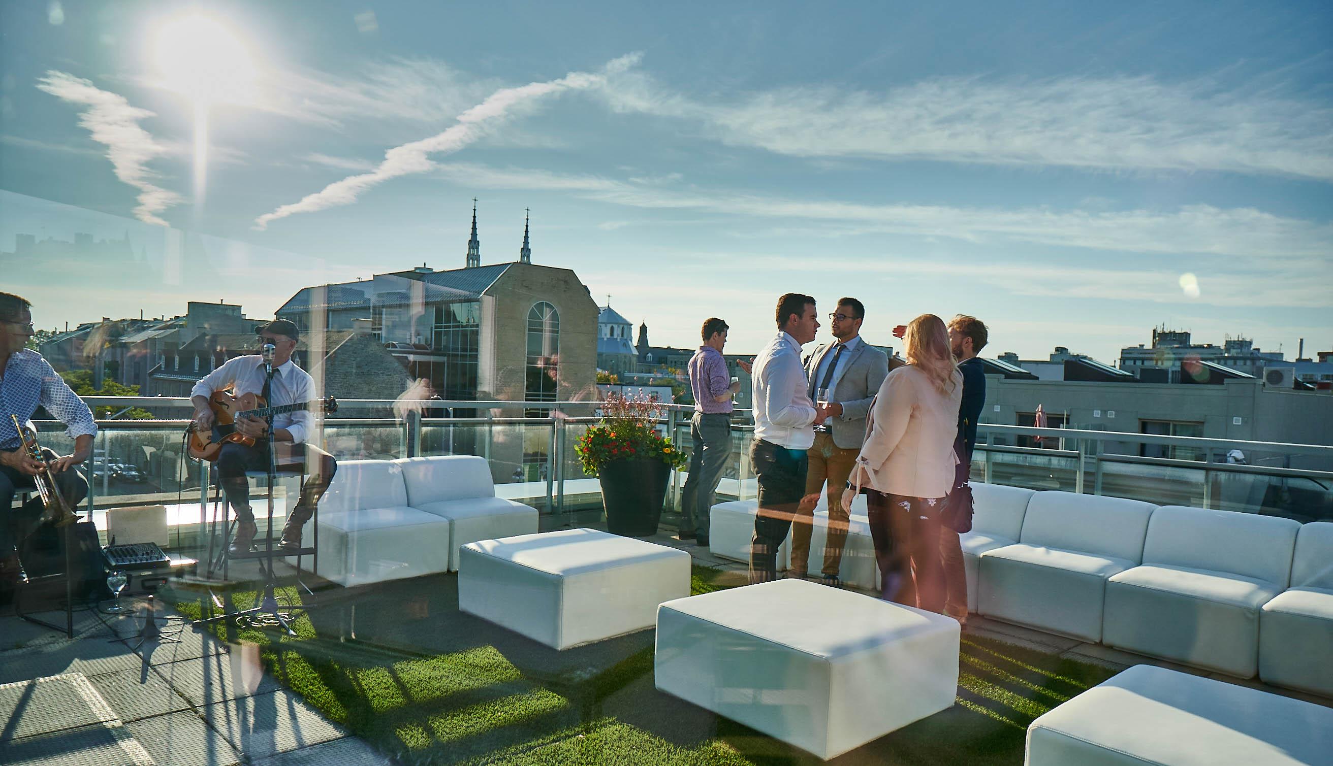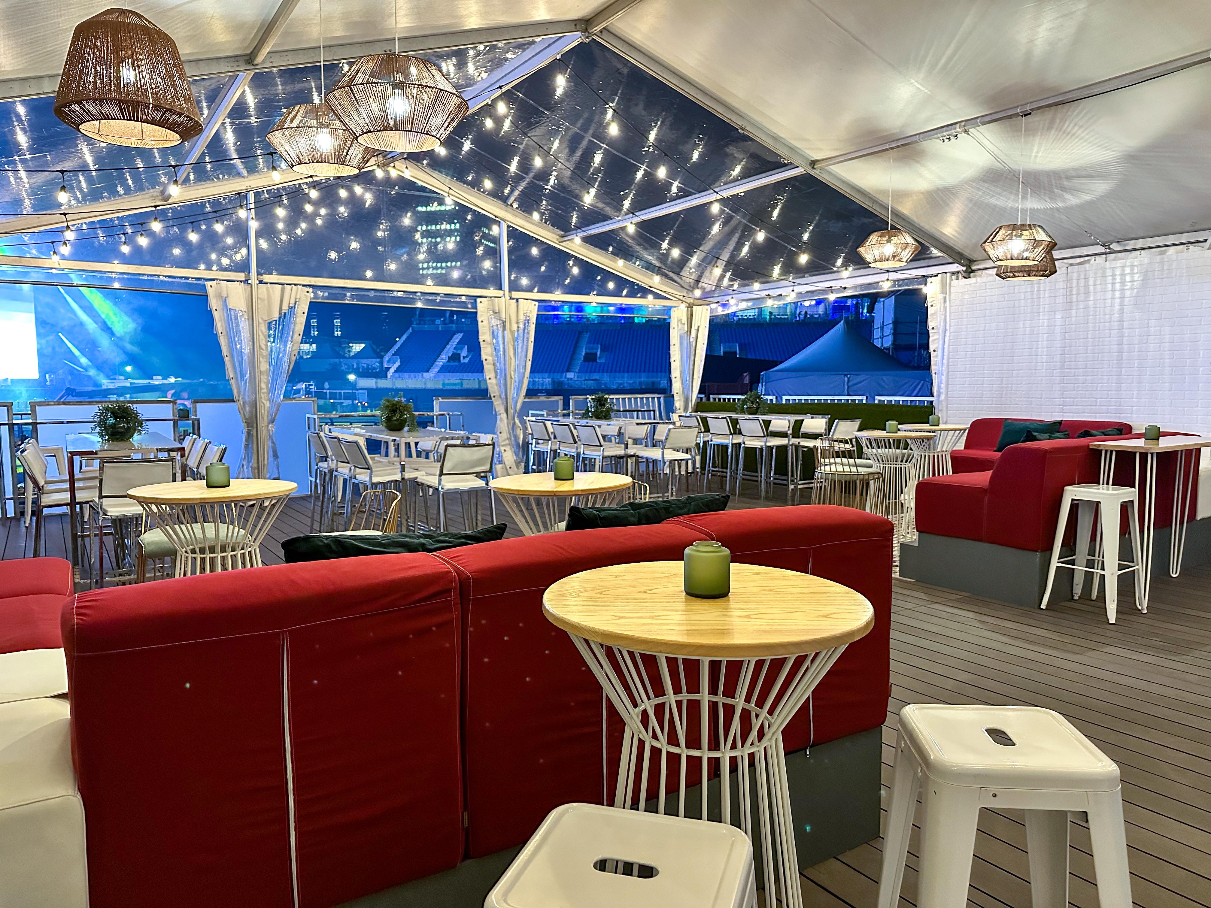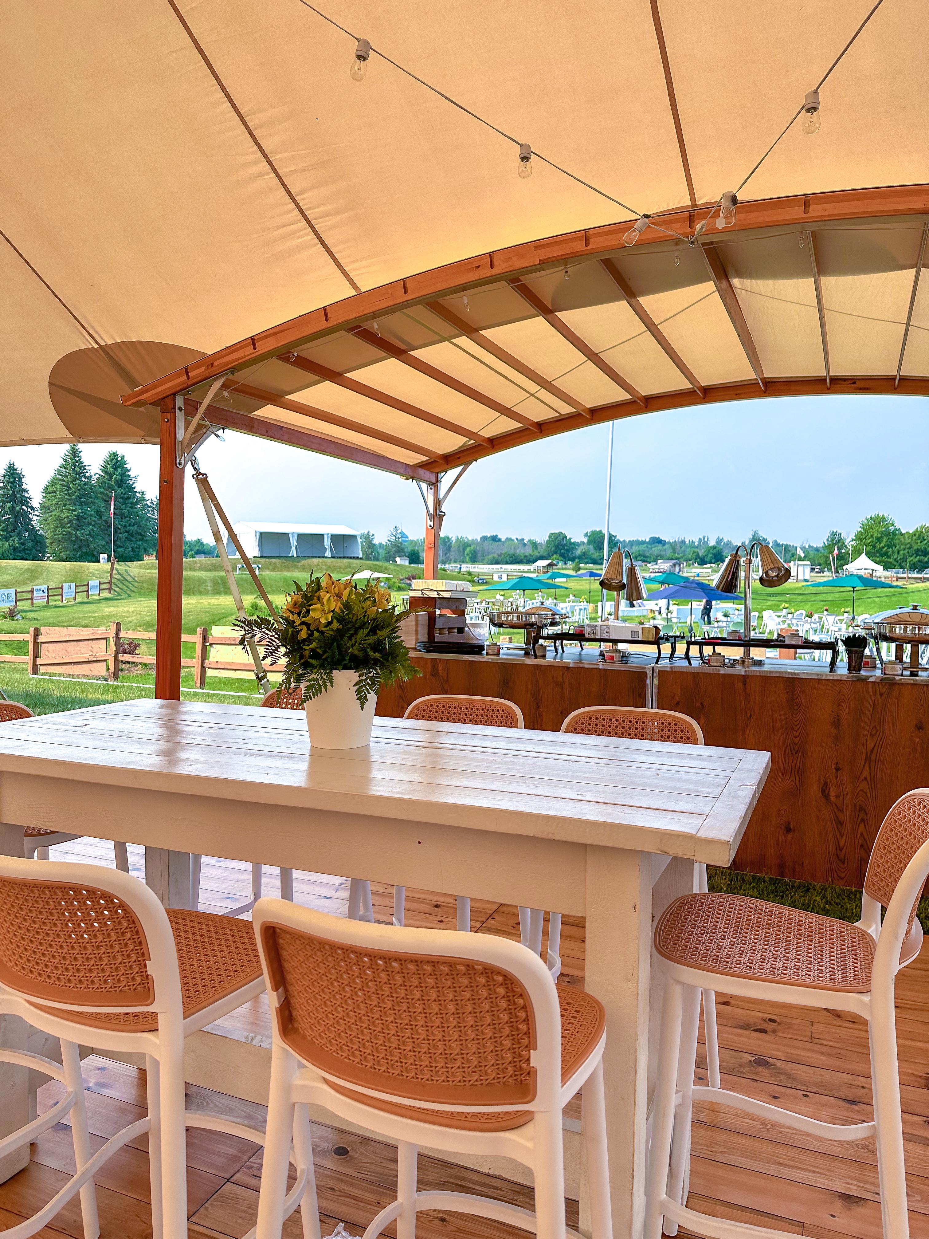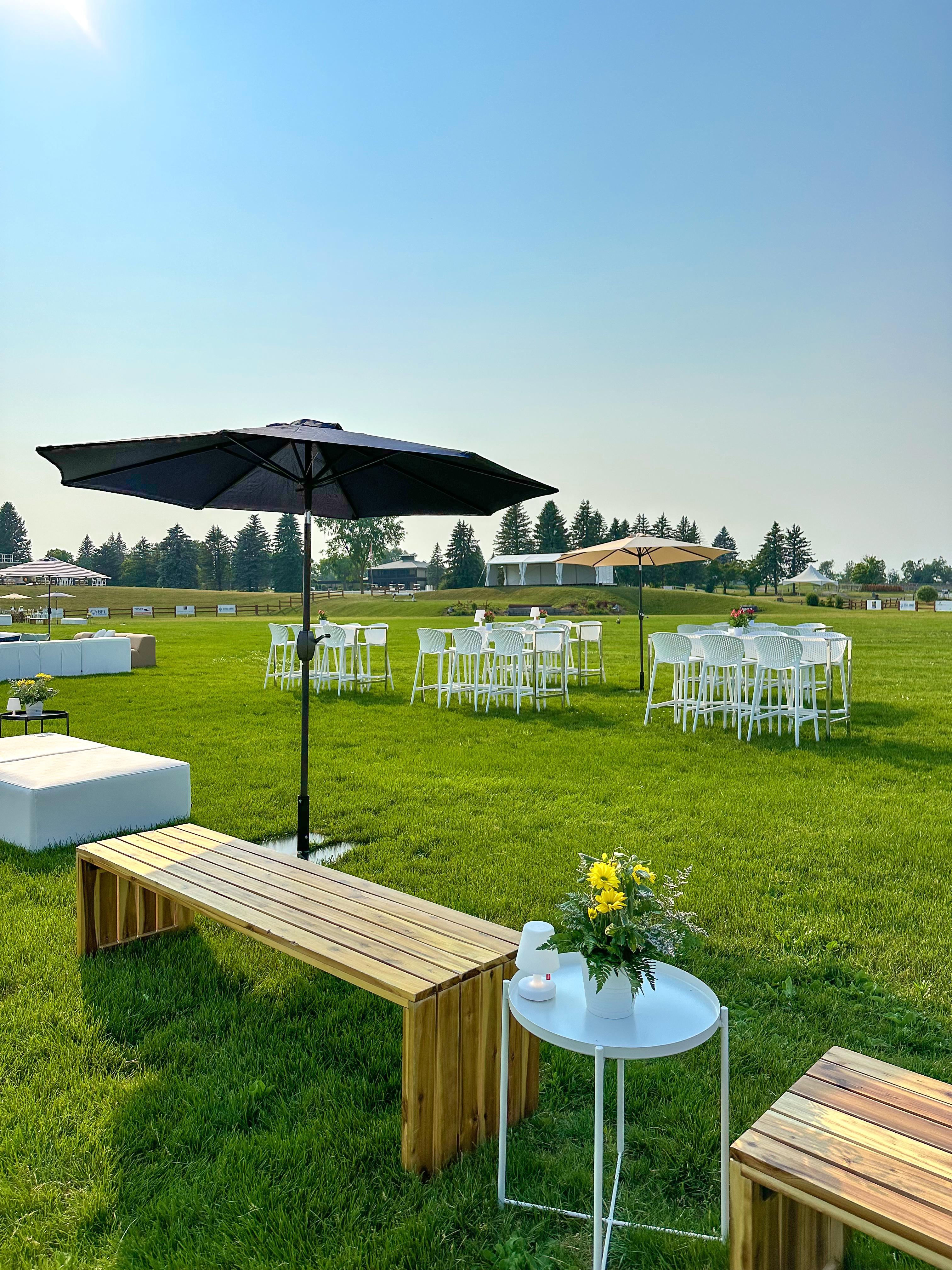 As a tent floor made of wood, a gravel parking lot, or a grassy area is rarely as even as a reception hall floor, it is important to consider choosing cocktail tables and stools with a strong and stable base. In the height of summer, our rental parasols will help protect your guests from the hot sun rays.