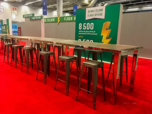 Dans un espace lounge, il est primordial de penser à la table à café. À côté d’un sofa comme table d’appoint ou au centre de plusieurs fauteuils comme table basse, elle servira à déposer verres et assiettes. Si tu as fourni des fauteuils pour tes conférenciers, pense à ajouter quelques tables d’appoint pour qu’ils puissent déposer leur verre d’eau et leurs notes.
